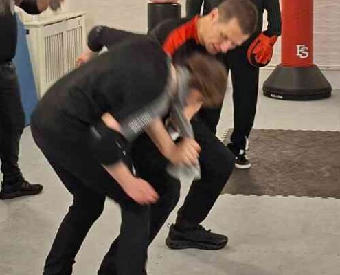Stefan Jöhnk erklärte den Teilnehmern verschiedene Möglichkeiten, um aus der langen Distanz zu starten. Dabei spielte auch die Ausgangsposition eine wichtige Rolle: Hängt der Gegenstand locker nach unten? Befindet er sich bereits in der Hand? Oder liegt er – wie etwa eine Jacke – über der Schulter? Für diese unterschiedlichen Situationen vermittelte er einfache und nachvollziehbare Lösungen, mit denen die Teilnehmer direkt arbeiten konnten.