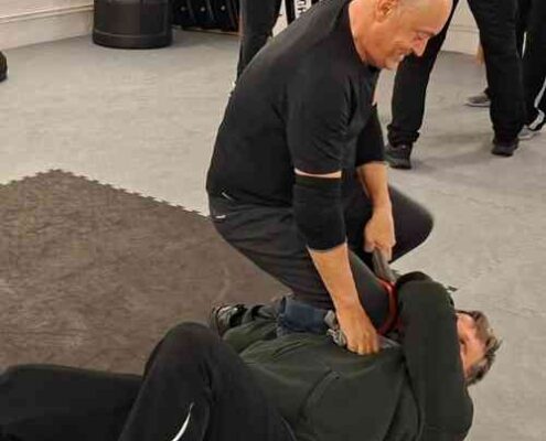 Da aus der Gruppe heraus Interesse an weiteren Anwendungsmöglichkeiten bestand, griff Stefan Jöhnk am Ende auch noch das Thema Kontrolle auf. Dabei zeigte er, dass flexible Gegenstände nicht nur für Schlaganwendungen interessant sind, sondern auch genutzt werden können, um jemanden zu Boden zu bringen und anschließend zu kontrollieren.