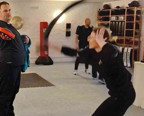 Die Teilnehmer arbeiteten daran, wie Bewegung, Schwung und Zielrichtung so eingesetzt werden, dass ein flexibler Gegenstand tatsächlich Wirkung entfalten kann. Schnell wurde deutlich, dass solche Gegenstände anders geführt werden müssen als starre Waffen. Timing, Distanzgefühl und das Verständnis für die eigene Bewegung spielten dabei eine besonders wichtige Rolle.
