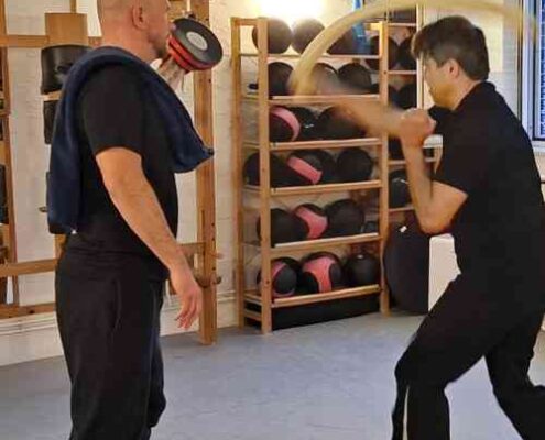 Im Lehrgang zeigte er, wie man auch auf engem Raum mit einem flexiblen Gegenstand Druck aufbauen kann. Dazu gehörten einfache Anwendungen, um auf Angriffe zu reagieren, Gegenschläge gegen Schläge einzusetzen und trotz kurzer Distanz handlungsfähig zu bleiben.